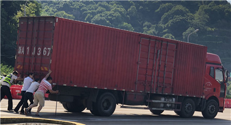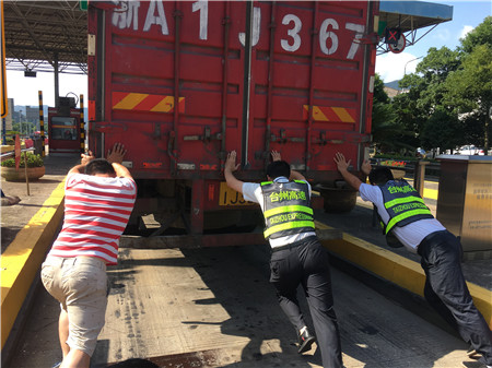 6月19日15時左右,一輛杭州牌照的大貨車,在進入臨海南收費所三車道時突然熄火拋錨,司機嘗試了幾次無法啟動,立刻下車檢查車況。 “師傅,怎么了?有什么能幫您?”收費員徐海源見此情景,立即上前熱心詢問。 “哎!包在油箱口的塑料紙怎么就掉進油箱內,現在車子怎么都發(fā)不動不了?!彼緳C有點發(fā)急地回答。 “師傅,別著急,我先找?guī)讉€同事幫您把車推出車道。”收費員趕緊安慰司機焦急心情。 “好的,那謝謝你們。”司機連忙點著頭。為了避免車道堵車,徐海源立刻利用對講機向當班班長周萍說明情況,周萍立刻關閉該車道,啟動備用車道。此時此刻,收費員李俊杰、楊旭佳毫不猶豫的趕了過來與駕駛員一起推動車子?!耙弧⒍⑷?,一、二、三,使勁呀……”可是車子仍然紋絲不動。怎么辦?請求支援!正準備下班的行政人員陳瑩、劉華萍得知情況后,二話不說飛奔到車道,加入到推車行列中。用力推呀——哎,不行;再來一次——還不行。面對23.97噸的大貨車,大家仍是束手無策。“去找根鐵棒試試!有道是給你一根鐵棒,我能翹起整個地球。”不知是誰大喊了一聲?!靶?,可以試試,快去找”話音剛落李俊杰快步跑向所內,尋找鐵棒。不一會兒,只見他興奮地高舉鐵棒沖著大家喊道:“找到了!找到了!”