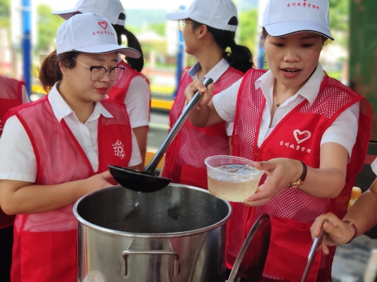 圖為志愿者合影 上午9點(diǎn),志愿者們身著統(tǒng)一紅馬甲,在崗?fù)さ陌踩珝u上設(shè)立服務(wù)臺,抬出食堂提前制作好的青草糊、綠豆湯等清涼飲品。你來分杯我來送,大家不亦樂乎開始了送清涼活動。