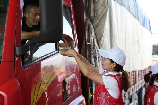 圖為志愿者給司乘遞上飲品 在送清涼的同時(shí),志愿者們還溫馨提醒司機(jī)朋友們不要疲勞駕駛,高溫天氣中注意行車安全,并為不熟悉路況的司乘指引路線。此外,工作人員還在“便民小藥箱”中補(bǔ)充了防暑等應(yīng)急藥品,以應(yīng)對高溫中暑等突發(fā)狀況。 一杯杯清涼的飲品,幾句簡短而溫馨的交流,拉進(jìn)了志愿者們與司乘人員之間的距離,司乘人員的好評將整個(gè)活動現(xiàn)場推向高潮。 該所共計(jì)送出200多份清涼飲品,受到廣大司乘人員的一致好評。大家用實(shí)際行動傳遞文明,延伸了服務(wù)的同時(shí),更展示出臺州高速人的良好形象。 楊雅芬