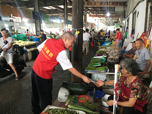 圖為志愿者在菜場(chǎng)宣傳垃圾分類 志愿者們特地選取菜市場(chǎng)、商鋪等人多且容易產(chǎn)生垃圾的地方,向店主和商販們宣講環(huán)境公害引發(fā)的負(fù)面后果及如何處理平時(shí)的生活垃圾,他們結(jié)合宣傳冊(cè)通俗、耐心地講解生活垃圾要從源頭開始分類投放:干濕要分開,對(duì)剩菜剩飯、瓜皮果殼等易腐垃圾要瀝干水分,投放后要蓋好垃圾桶,免得蚊蠅滋生;紙類、飲料瓶、金屬等有再生利用價(jià)值的要放在可回收的垃圾桶里;對(duì)電池、電子產(chǎn)品、殺蟲劑、油漆桶等含有害化學(xué)物質(zhì)的要單獨(dú)放;剩余的作其它垃圾處理。