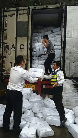 圖為工作人員幫忙搬運掉落的貨物 這輛滿載海鮮的綠農車,貨物掉滿車道,司機一人束手無策,當班班長陳豐平在拍完綠農照片后,叫上班員林葉輝,一起快速幫助司機一件一件地傳遞貨物。盡管每一袋貨物都十分重,但是他們?yōu)榱藥椭鷰煾堤嵩缯碡浳铮櫜坏媚樕辖豢椀暮顾陀晁?/span> 由于工作人員的幫助,司機離開時一直道謝。他們對司乘人員的主動援助,使得溫嶺西收費所的服務不單單停留在窗口問候上,還將延伸服務一直呈現。 陳豐平