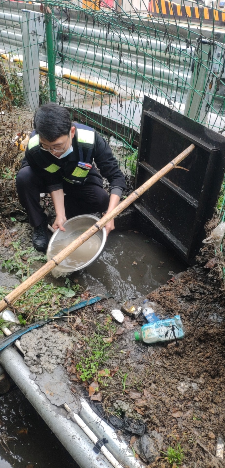 找出原因后,鄭星趕忙跑到所里取來一個水盆和一根木桿子。他用木桿支起排水坑上的蓋板,將坑里的積水一盆一盆地舀到旁邊的排水溝里。引導完車輛的林華平也過來協(xié)助鄭星。雖然此時外面下著雨,但他們?nèi)粵]顧上,只盼著舀水這個措施能夠有效,11號車道能夠早點恢復使用,進口秩序能夠早點恢復正常。 最后在鄭星和林華平的冒雨搶修下,排水坑里的水位總算有所下降,11號車道在關閉二十多分鐘后終于恢復使用,進口車輛也恢復暢通。 因地磅傳感器長期被雨水浸泡,可能還存在一些潛在問題。再者,排水坑里的水位雖有所下降,單憑人力實在無法在短時間內(nèi)排掉剩余積水。考慮到這些問題,班長在搶修過后又將情況匯報給了維養(yǎng)中心,維修人員后序針對地磅問題進一步展開排查和維修工作。 趙育辰