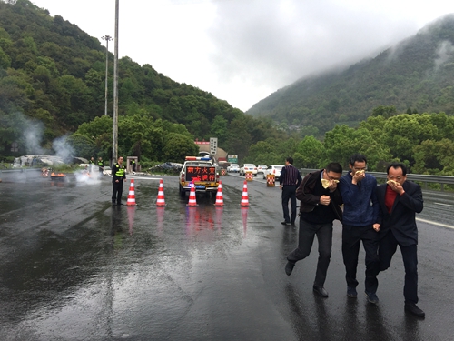 圖為安全有序疏散群眾現場 執勤隊緊急出動,趕赴事故現場。“哎呀,著火啦!”事故車上司乘人員呼喊著:“快!快救火!快救人!”一組人員迅速擺放安全警示牌后,快速有序地將滯留群眾疏散到安全位置,另一組人員利用消防水槍滅火,控制事故車輛火情蔓延,值勤隊長根據現場判斷,果斷地通知中控員開啟隧道風機系統,對隧道內濃煙進行處理,隨后成功撲滅大火。
