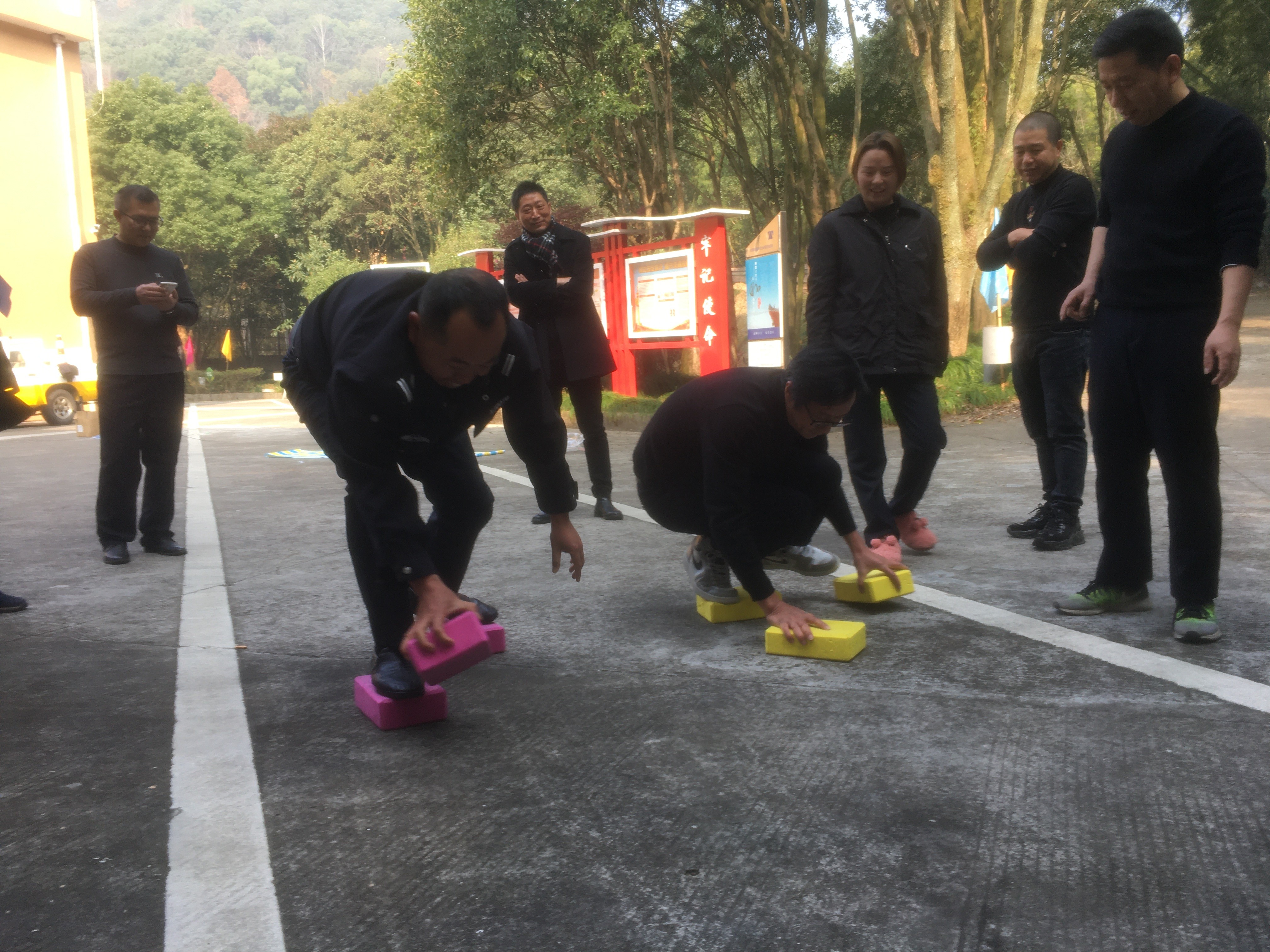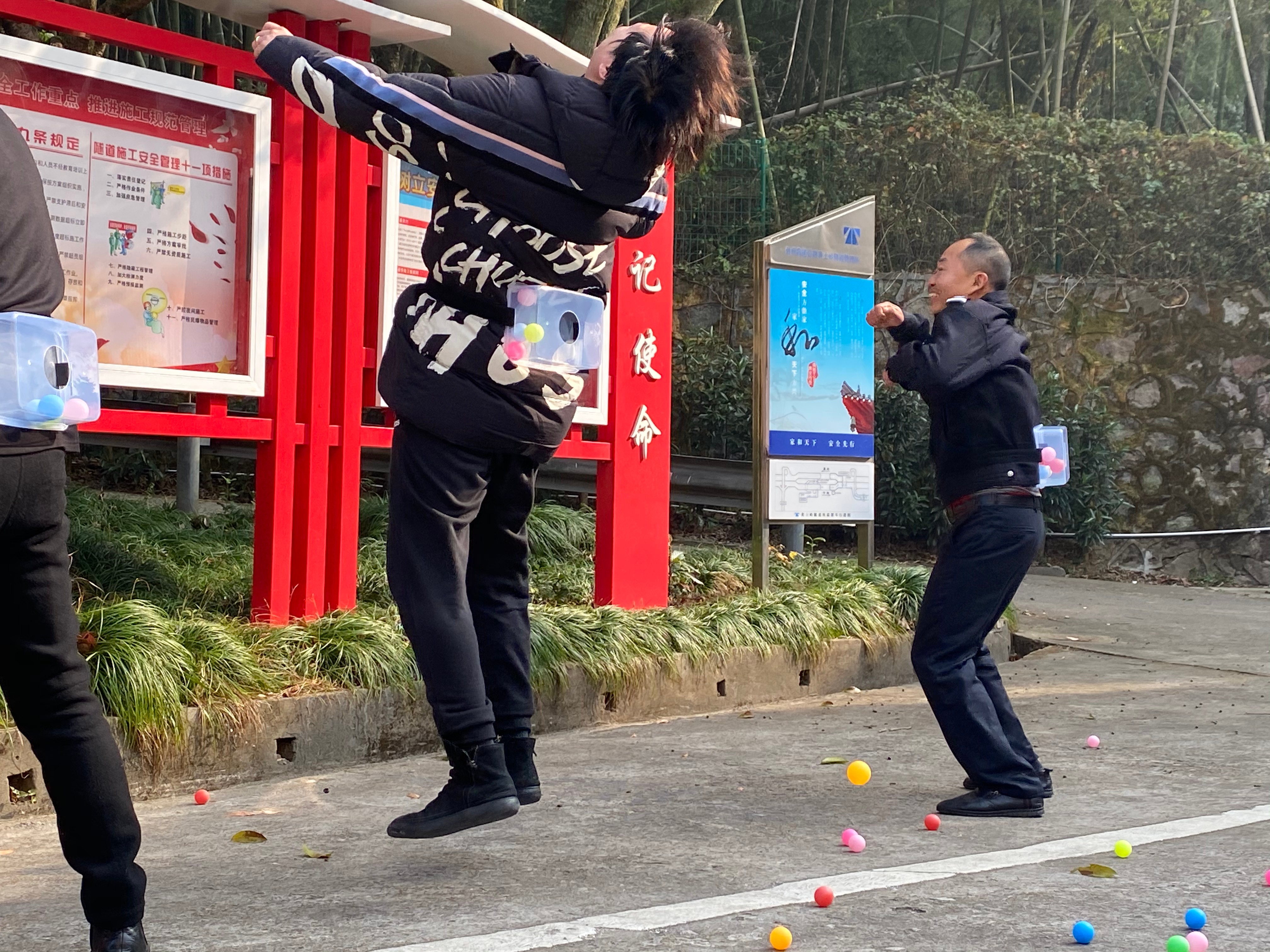 12月29日上午,臺州高速黃土嶺隧道所舉辦了一場別開生面的趣味運動會,寬闊的廣場上充滿了歡聲笑語,吶喊聲、加油聲此起彼伏,隧道所領導與全體員工積極參與、共同合作。 本次“運動會”分個人與團體兩種形式,個體項目有投籃、飛鏢、電臂達人等,團體賽項目分別是無敵風火輪和摸石過河。 “預備,開始!”隨著裁判員一聲令下,摸石過河比賽開始了,選手們迅速進入狀態,彎腰、拿磚、邁腳,隊員竭盡全力地將腳下的磚塊不停地移動。兩只腳踩在一塊磚上,兩只手把另外兩塊磚不斷地向前移動。“還有5米、2米,堅持??!”隊員們個個腳疼腿軟,但毫不松懈,勇爭第一,最后執勤二隊一舉勝出。