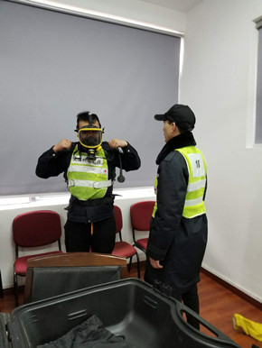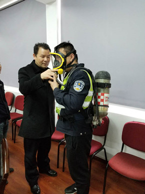 培訓(xùn)中,陶文輝講解了“高速隧道火災(zāi)特點(diǎn)”及呼吸器、防化服的使用方法及相關(guān)要求。話題開啟后,隊(duì)員們紛紛參與討論,爭(zhēng)相發(fā)言,講述各自在隧道事故處理中施救和應(yīng)對(duì)的經(jīng)歷與心得,交流平日巡查中所需注意的事項(xiàng),互相提醒工作中的不足,并針對(duì)實(shí)際問題提出了許多建設(shè)性意見。同時(shí),在主講人的現(xiàn)場(chǎng)演示下,參訓(xùn)人員逐個(gè)“以身試法”,進(jìn)一步熟悉和掌握了防毒面罩的穿戴方法。