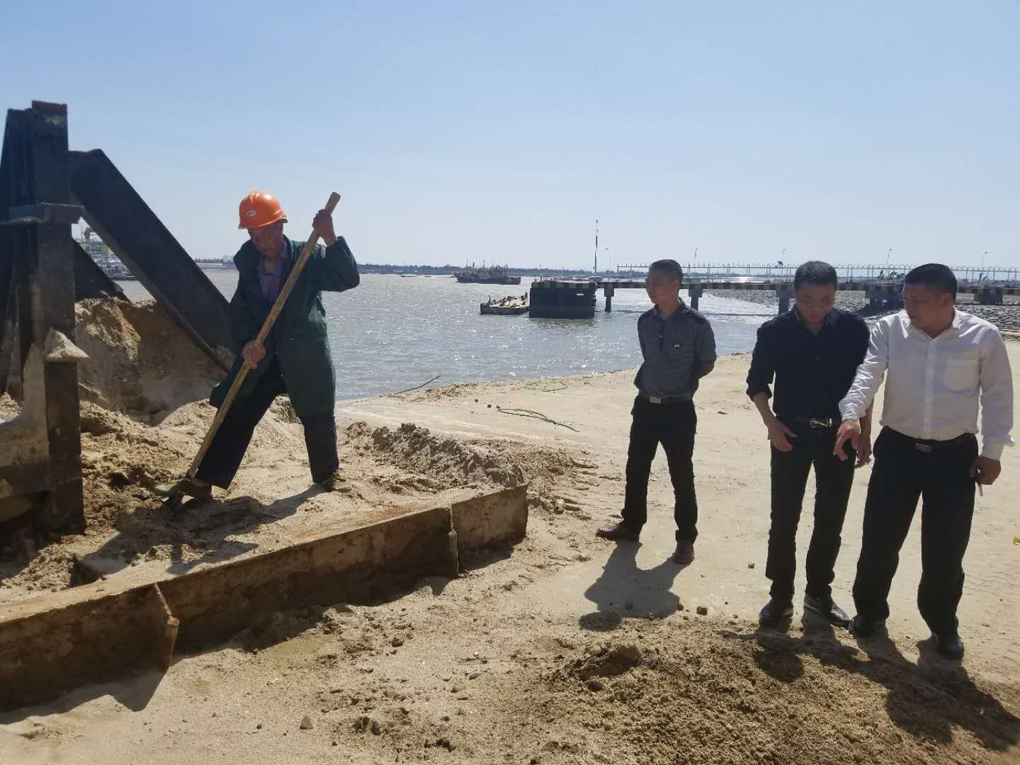 圖為員工詢問工人海沙用途