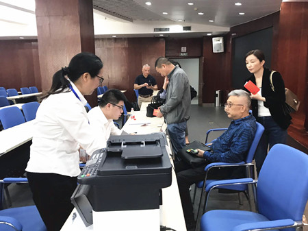 上圖為工作人員在溫嶺市政府設置流動點為股東服務