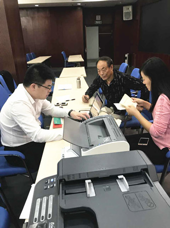 戴著一副黑框眼鏡,憨實魁梧的身形,說話輕言慢語。據說,某天下班后,還坐在椅子上打電話,一臉溫柔,竊竊私語,同事一直以為他在談戀愛,這打完了電話,才知道是接到股東的電話了,跟對方在解釋股權收購政策呢。 在股權流動收購點,小李是電腦操作人員,所以也不大參與解說工作。只是那天正好一位阿婆坐在了電腦對面,說話之間才知大字不識,是聽鄰居說的,就自己摸到這里了。正好手里也空了,李騰飛頓頓身子,放松下來,以黃巖特有的吳言儂語跟阿婆解釋了十幾分鐘,果然,白凈的臉上是一臉的和氣,沉穩(wěn)又實在,確實是傳說中的暖男一枚呀。末了,幫阿婆代簽了字,讓阿婆按了手指印。 但是,在工作的時候,小李讓我們見識到了“騰飛”的效果。流動點只設一臺筆記本電腦,線上操作都歸他,在大溪鎮(zhèn)政府,來的股東有百十號,流動小組包括駕駛員何杰靚迅速開展了流水作業(yè)。此時此刻,小李那一雙肥白的大手在小巧的鍵盤上十指翻飛,靈活敏捷,操作如行云流水,打印機刷刷地響,不停飛出一份份協議,傳到下一個工作人員這里。這才知道,每一個人的名字都是名副其實的,“騰飛”的含義是在這里體現的呀。 鄭蔚