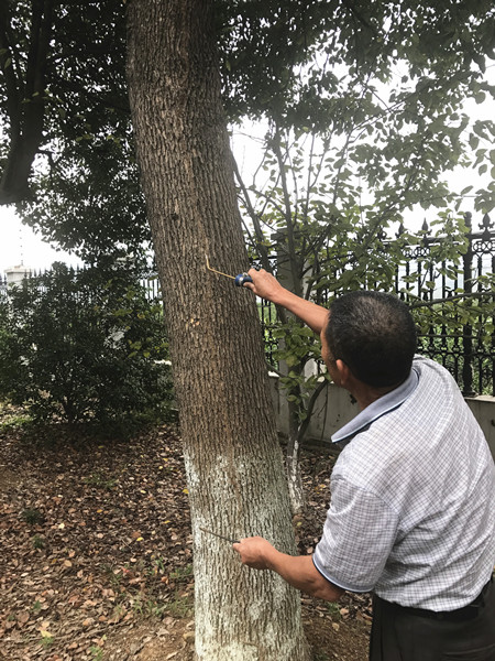 上圖為技術(shù)人員在防治白蟻受災(zāi)處 為全面消除隱患,該所立即組織人員對(duì)員工宿舍、綠化帶、辦公樓逐一進(jìn)行地毯式排查,最終發(fā)現(xiàn)三處地方受災(zāi)最為嚴(yán)重,同時(shí)在員工宿舍旁綠化帶處找到白蟻窩。該所負(fù)責(zé)人及時(shí)聯(lián)系建設(shè)局房管處白蟻防疫站技術(shù)人員,對(duì)樹木、門框等進(jìn)行防治消殺和用白粉涂擦等方式排除隱患,通過防治消殺和白粉涂擦等方式,有效確保了所內(nèi)環(huán)境的生態(tài)資源健康和安全。