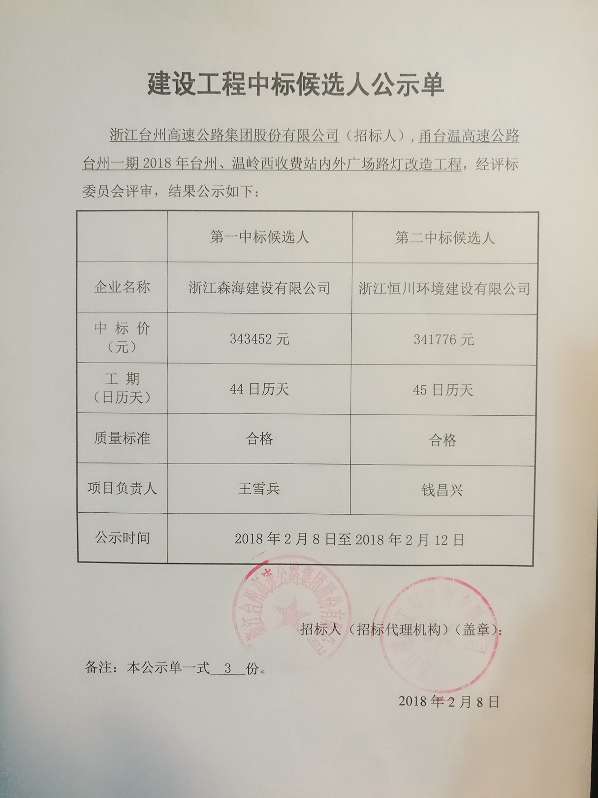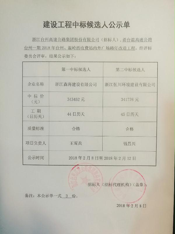 2018年臺州、溫嶺西收費站內外廣場路燈改造工程中標候選人公示單