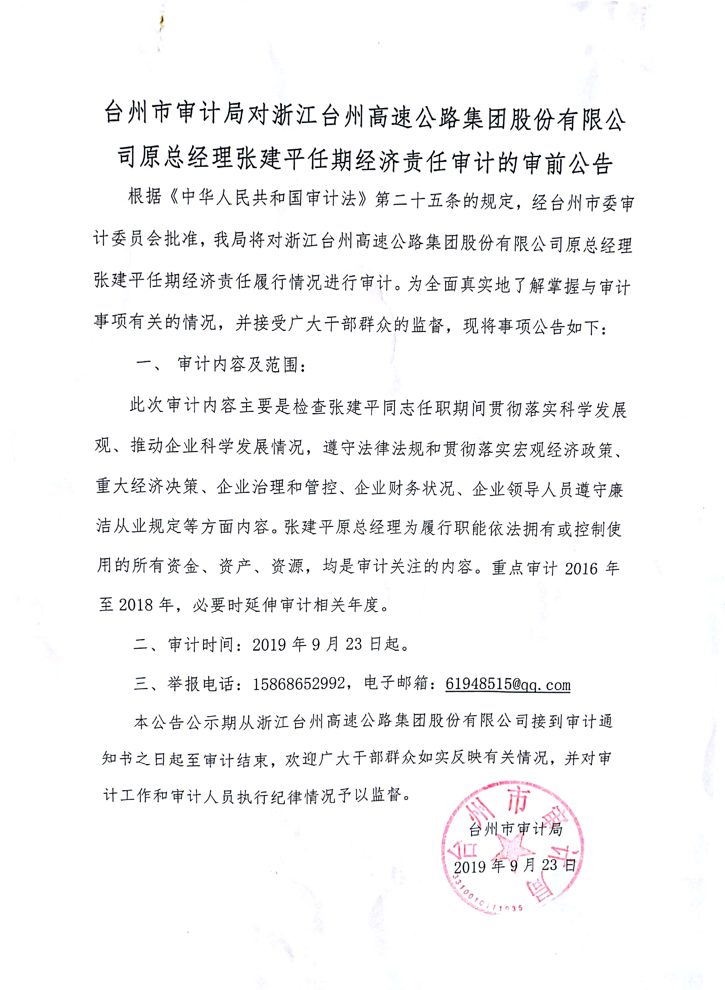 臺州市審計局對浙江臺州高速公路集團(tuán)股份有限公司原總經(jīng)理張建平任期經(jīng)濟(jì)責(zé)任審計的審前公告
