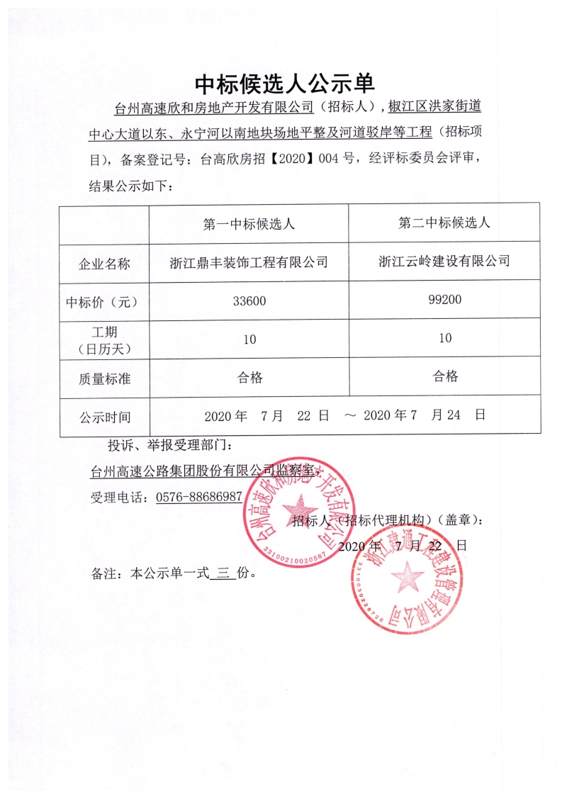 椒江區洪家街道中心大道以東、永寧河以南地塊場地平整及河道駁岸等工程(招標項目)中標候選人公示單