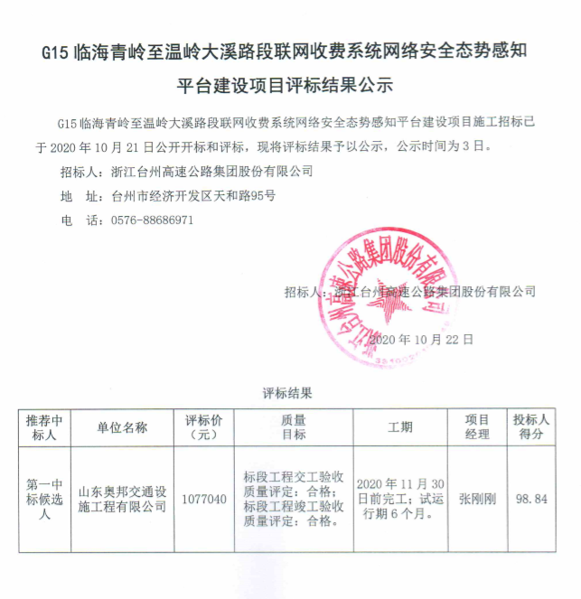 G15臨海青嶺至溫嶺大溪路段聯(lián)網(wǎng)收費(fèi)系統(tǒng)網(wǎng)絡(luò)安全態(tài)勢(shì)感知平臺(tái)建設(shè)項(xiàng)目評(píng)標(biāo)結(jié)果公示
