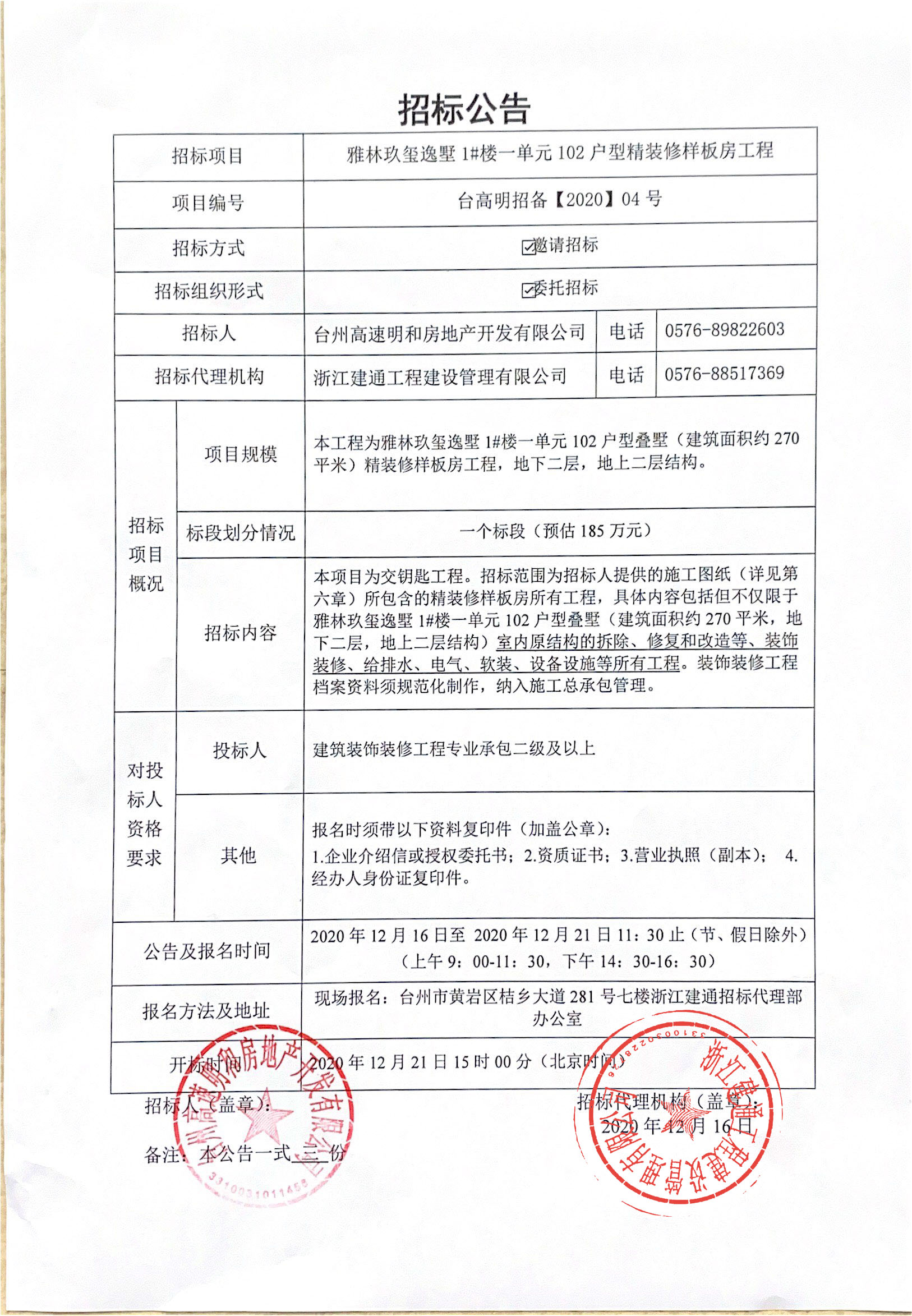 雅林玖璽逸墅1#樓一單元102戶型精裝修樣板房工程招標公告