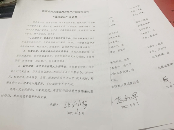 圖為全體黨員觀看廉政教育短視頻《國畫》  圖為簽訂“廉潔家風(fēng)”承諾書 根據(jù)集團(tuán)公司《關(guān)于組織開展“廉政教育月”活動(dòng)的通知》文件要求,為推動(dòng)“不忘初心、牢記使命”主題教育常態(tài)化,深入學(xué)習(xí)貫徹黨的十九大和十九屆二中、三中、四中全會(huì)及十九屆中紀(jì)委四次全會(huì)精神,嚴(yán)守黨的政治紀(jì)律和政治規(guī)矩,更好地落實(shí)黨風(fēng)廉政建設(shè)有關(guān)要求,高速房產(chǎn)公司黨支部組織了這次專題活動(dòng)。全體參會(huì)人員一起觀看廉政教育視頻,宣讀“廉潔家風(fēng)”倡議書,簽訂“廉潔家風(fēng)”承諾書,開展“廉潔文明家風(fēng),黨員干部示范”大討論。 此次黨風(fēng)廉政專題活動(dòng)進(jìn)一步增強(qiáng)了黨員干部的廉潔意識(shí)、防范意識(shí),起到帶頭正品行、立家規(guī)、嚴(yán)家教、樹家風(fēng)建設(shè)的表率作用,以好家風(fēng)促黨風(fēng)帶社風(fēng)民風(fēng),為新形勢(shì)下臺(tái)州高速房產(chǎn)事業(yè)貢獻(xiàn)力量。 鄭攀